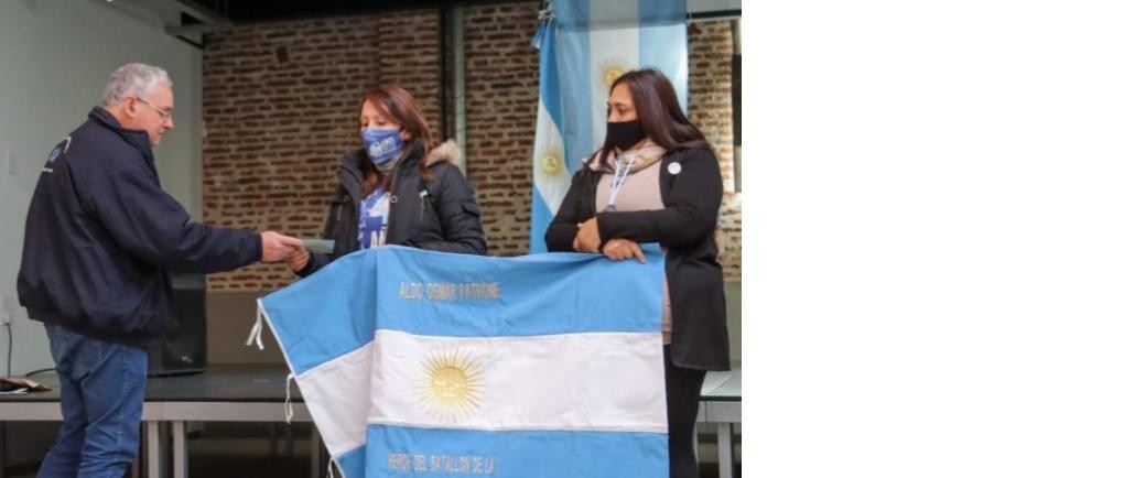 A continuación los veteranos entregaron a Ángela y Liliana Patrone una bandera nacional con el nombre de Aldo Patrone bordado en oro y Rico Zini obsequió a la menor de ellas la medalla conmemorativa que el Partido de Pergamino encargó por los 40 años de la guerra.