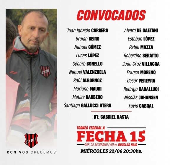 El técnico de Douglas haig, Gabriel Nasta, convocó a veinte jugadores para concentrar previo al partido con Defensores de Belgrano de Villa Ramallo del próximo miércoles a las ocho y media de la noche por la fecha 15 del Torneo Federal A.