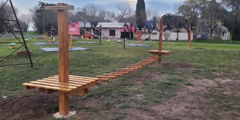 Se trata de una cancha de futbol tenis y tirolesa con pasaje colgante de madera para los más chicos.