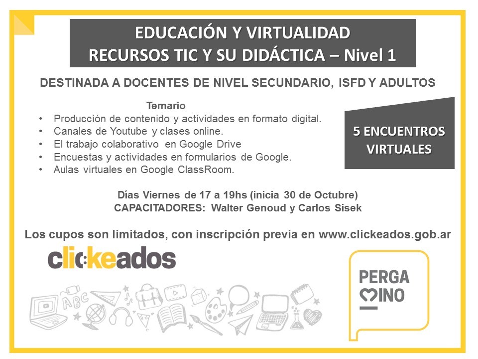 La Subsecretaría de Educación de la Municipalidad de Pergamino, a través del Programa Clickeados, invita a docentes de nivel secundario, ISFD y Adultos a participar de la segunda cohorte del curso “Educación y Virtualidad. Recursos TIC y su didáctica – Nivel 1”, donde se abordarán los siguientes temas: producción de contenido y actividades en formato digital; canales de YouTube y clases online; el trabajo colaborativo en Google Drive; encuestas y actividades en formularios de Google; aulas virtuales en Google ClassRoom.