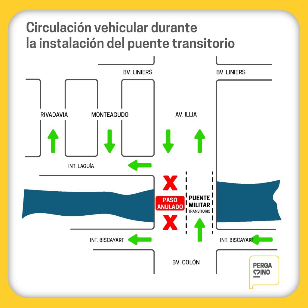 Asimismo, se informa que durante el período que dicho puente esté colocado cambiará el sentido calle Laguía, siendo el mismo desde Av. Illia hacia Rivadavia. Cabe recordar que en el día de hoy el Ejército Argentino comenzará con el armado de las estructuras sobre el actual paso que une Av. Illia y Bv. Colón.
